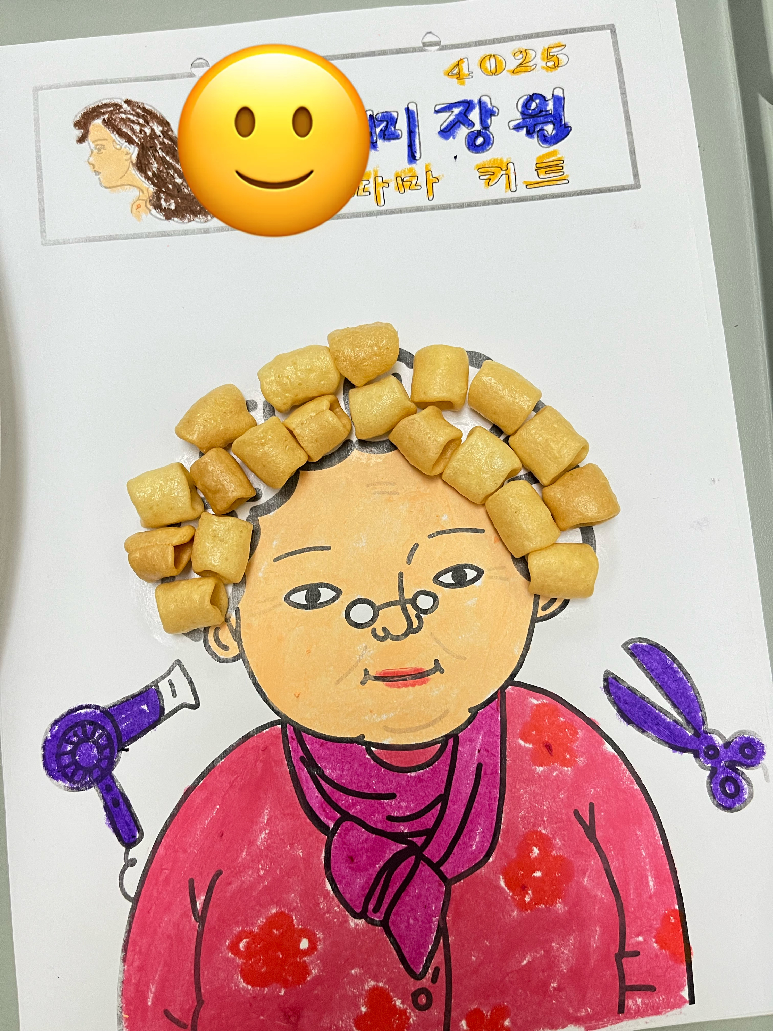 오늘은 미장원 머리 꾸미기 프로그램 진행하였습니다. 과자를 사용한 프로그램인만큼 참여 어르신 모두 즐겁게 참여하셨습니다^^